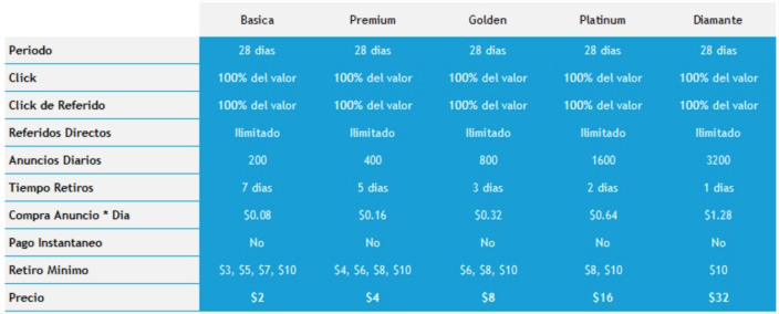 COMO GANAMOS DINERO: Podemos ganar dinero de dos formas distintas. Una de ellas es por clickar anuncios diarios y la otra es por sus RR (Referidos Rentados Bots), que tienen una ganancia fija mensual. Todo queda resumida en la siguiente tabla de membresias: