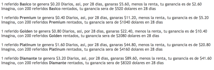Ahí podeis ver los precios de cada referido y los beneficios netos de cada uno. Con cualquier membresía, puedes rentar a cualquiera , ese decir, que si eres básico, puedes rentar referido diamante.